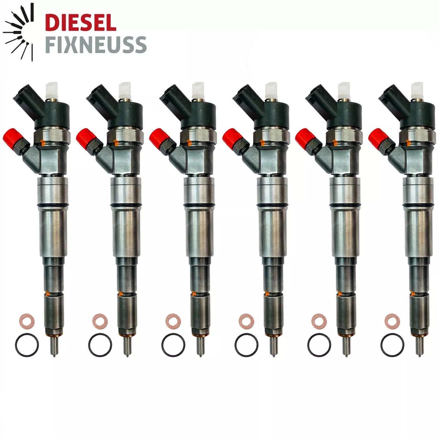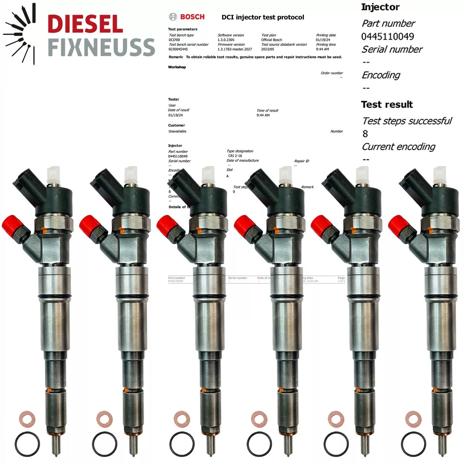 6x AT injector incl. copper sealing ring + O-ring + BOSCH test report supplied.
