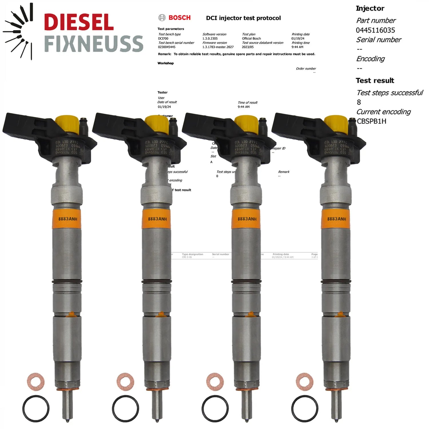 4x iniettori AT con anello di tenuta in rame + O-ring + rapporto di prova BOSCH in dotazione.